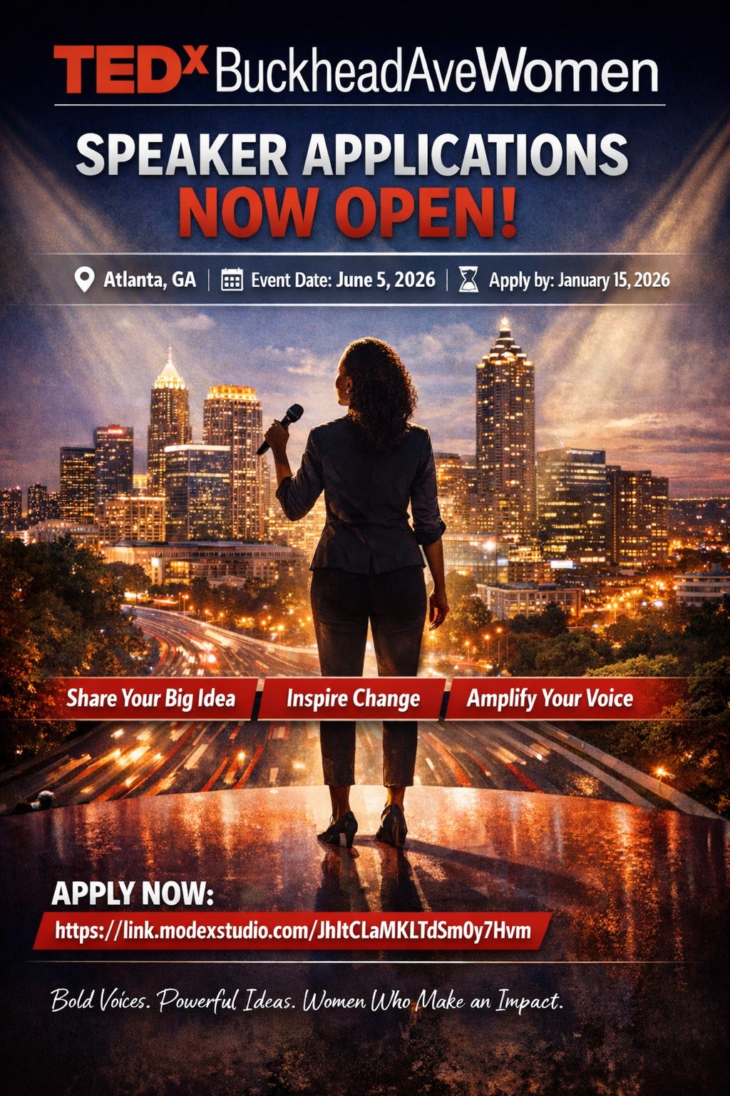 TEDxBuckheadAveWomen is a women-centered stage spotlighting ideas that shift thinking and spark meaningful action. This platform is designed for women with bold, grounded perspectives who are ready to share ideas that resonate beyond the stage.